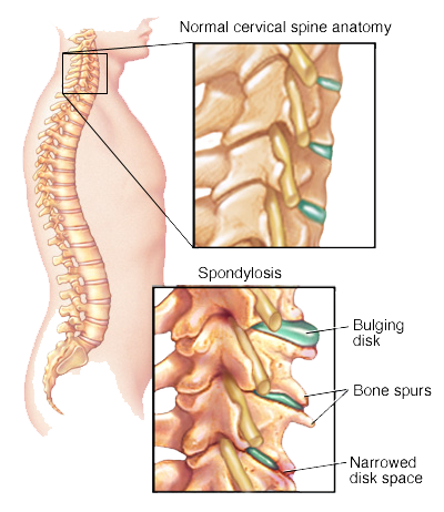 Neck pain that extends toward the shoulder, between the shoulder blades, and even pain in the back of the head. There may also be radicular symptoms with pain, numbness, or weakness extending into the arms or legs. If severe, loss of coordination and bowel or bladder incontinence may occur.